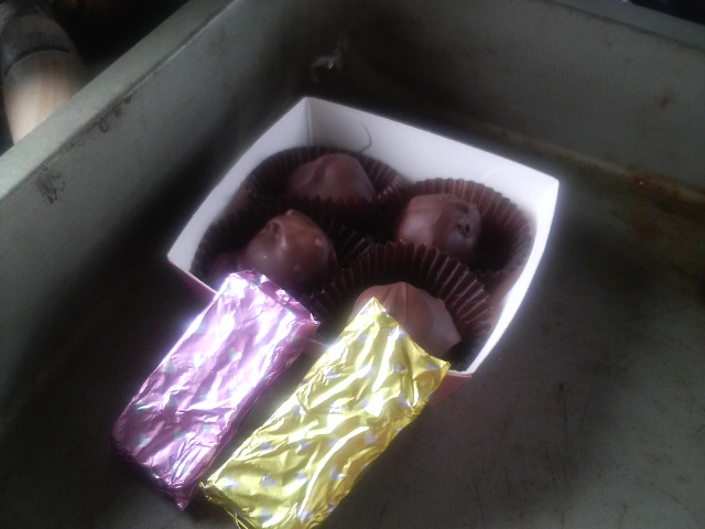 丸いのは苦めの生チョコに甘いチョコレートをコーティング。その残ったコーティングチョコに家で余っていたクラッカーを混ぜて固めたものが銀紙に包まれているのです。