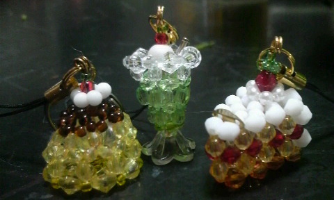 左の写真はダイソーで売ってるビーズのセットで作ったものです。左からプリン・クリームソーダ・ショートケーキ。右二つはいわなくても分かるけど、プリンは形が崩れているため、分かってくれる人が少ないです。っていうかぶらさげると、より縦に伸びて分からなくなるという微妙な代物。はじめは簡単なものから作った方がいいと思ってプリンを購入したのですが……全然そんなことはなかった。